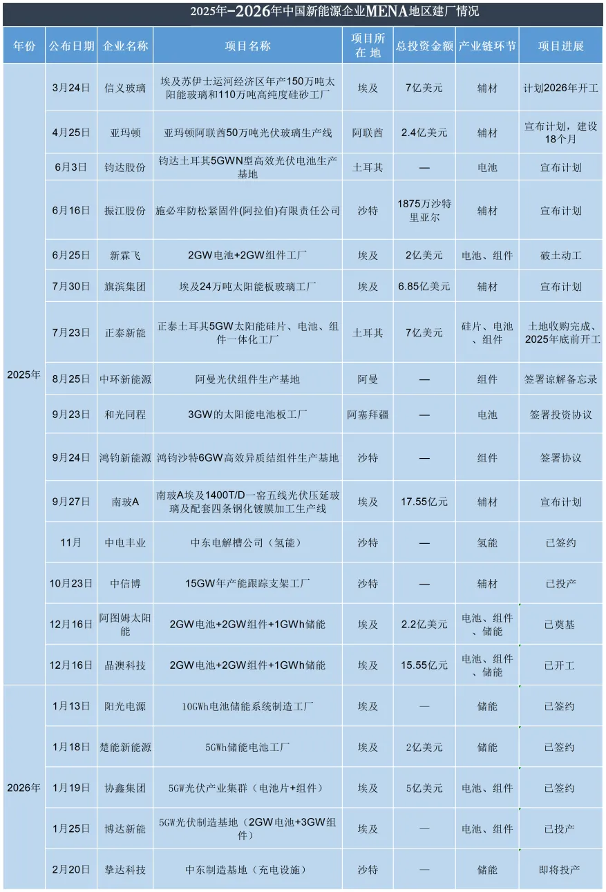 同时,2025年中国新能源企业在MENA地区的产能布局也呈现爆发式增长,全年落地多个重大制造项目,涵盖光伏全产业链(硅片、电池、组件、玻璃、跟踪支架)及储能、氢能等新兴领域,形成“光储氢”协同发展的新格局。目前,超过20家国内企业在此布局产业链,总投资规模超200亿元。