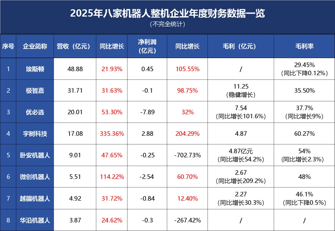 八家机器人整机企业2025年财务状况速览