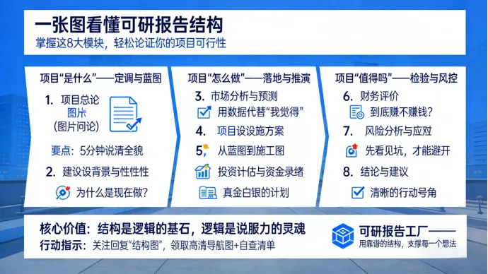 因为当你掌握了这个结构,你就能获得两大核心能力: “解构”能力: 再看任何一份复杂的报告,你都能迅速将它拆解到这八个模块,理解作者的逻辑,抓住重点,看穿薄弱环节。 “构建”能力: 当你需要为自己的项目构思报告时,这个结构就是你的最佳检查清单,确保你的思考是系统、全面、无遗漏的。 在「可研报告工厂」,我们所有的报告,都严格遵循并优化这套专业结构。 因为我们坚信:结构是逻辑的基石,逻辑是说服力的灵魂。 如果你觉得梳理这些结构依然耗时费力,或者对其中某个模块(如财务测算、市场分析)感到棘手——这正是我们存在的意义。 「可研报告工厂」能为你提供: 你可以选择整个“骨架”,也可以只补齐你最需要的那块“拼图”(比如,只做专业的市场分析章节或财务模型)。 上述每一个模块,都由具备十年以上经验的资深分析师操刀,确保数据扎实、逻辑严密。 我们的标准化流程,能将你的时间从繁杂的资料梳理和模型构建中解放出来,并用更优化的成本提供专业成果。 为了让你更直观地体验专业结构的力量,我们准备了一份礼物: 【关注本公众号,并回复“结构图”】,你将获得: 一张更高清、可下载的“可研报告核心结构导航图”。 一份对应上述八大模块的《可行性研究报告自查清单.docx》。 希望这张“地图”,能帮助你更清晰地规划你的商业征程。 可研报告工厂——用靠谱的结构,支撑每一个伟大的想法。