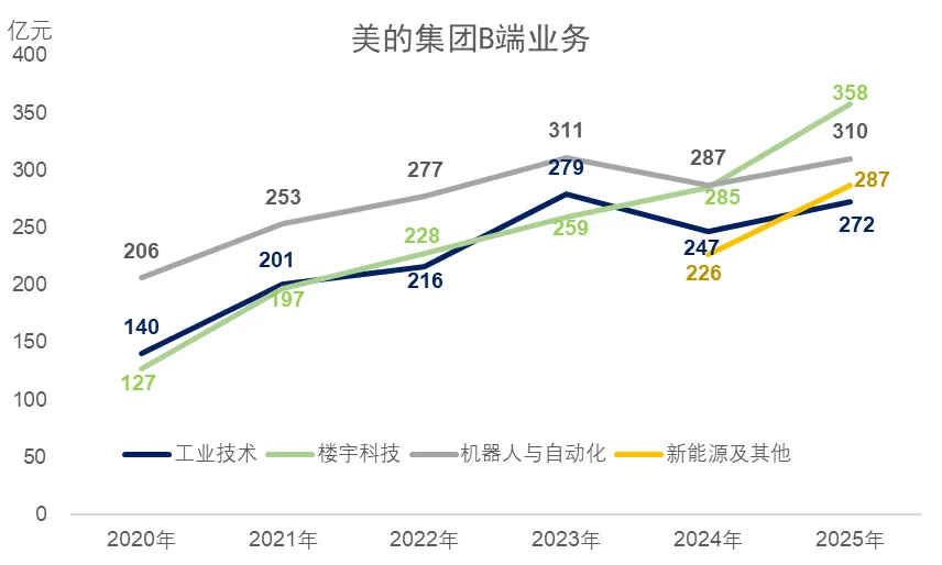2025年年报,美的集团B端业务的财报信息披露进行了一次比较明显的调整,那就是将新能源板块从“工业技术事业群”拆了出来,这也是美的比之前更重视新能源业务的直观表现。