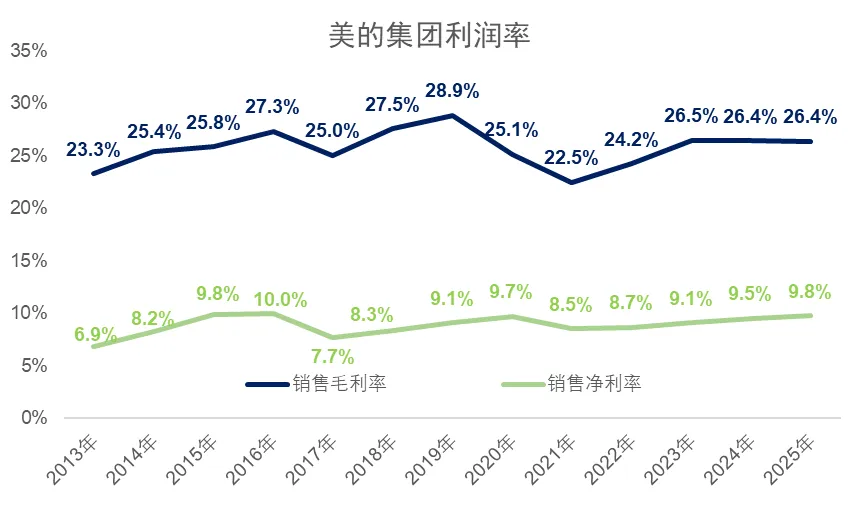 2025年,美的集团的毛利率保持在26.4%的正常水平,净利率相比于2024年继续小幅上升,达到了9.8%的近十年最高点。