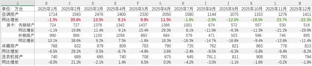 根据腾讯元宝整理的产业在线数据,2026年前三个月,家用空调总排产5334万台,同比下降8.6%;冰箱总排产2235万台,同比下降3.5%;洗衣机总排产2174万台,同比下降2.8%。而回顾2025年全年各个月份的排产数据,上半年的增速基数比较高,下半年比较低。