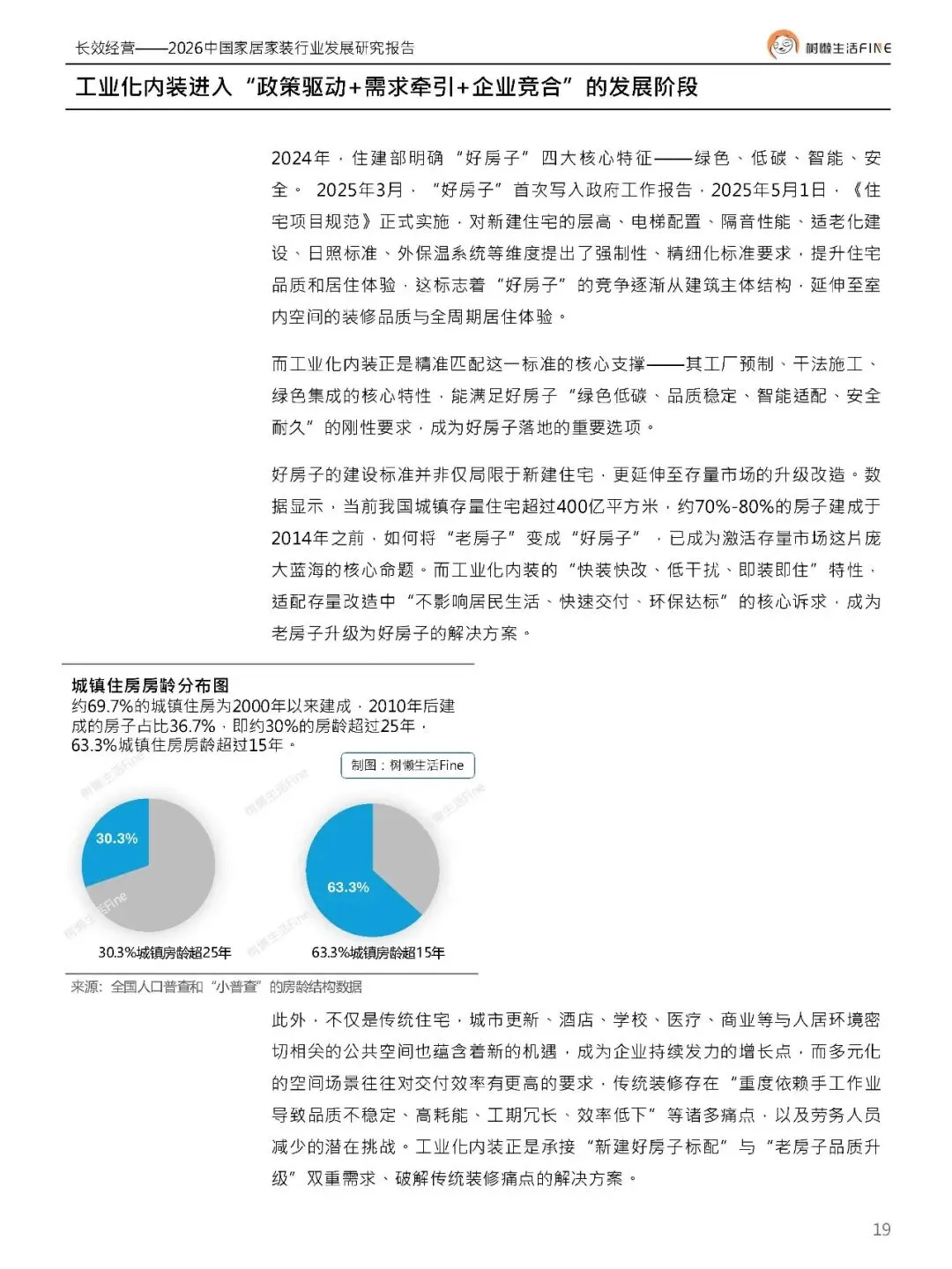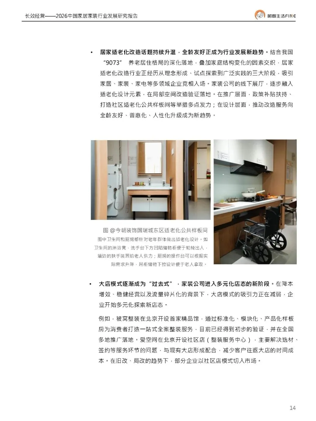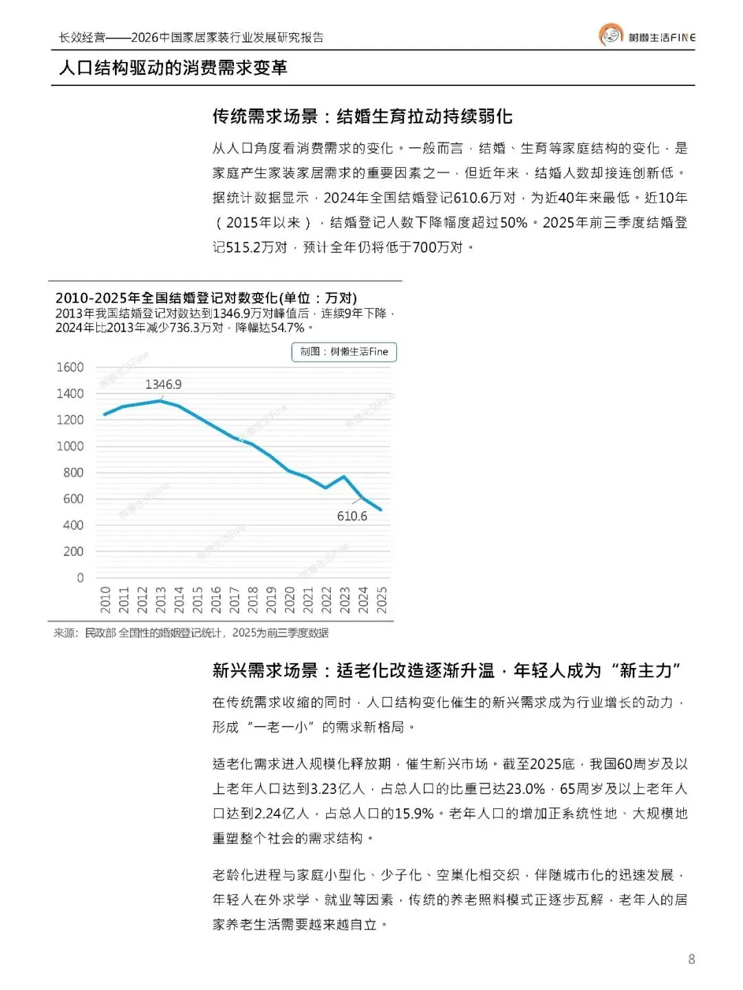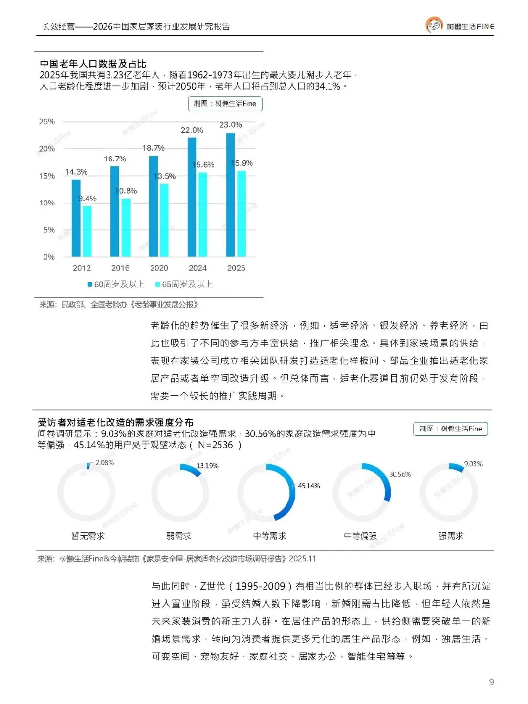 与之相对的,是人口结构变化催生的新需求格局。截至 2025 年底,我国 60 周岁及以上老年人口达到 3.23 亿人,占总人口比重 23.0%,65 周岁及以上老年人口 2.24 亿人,占比 15.9%。老龄化进程直接推动居家适老化改造需求的升温,数据显示,9.03% 的家庭对适老化改造有强需求,30.56% 的家庭改造需求强度为中等偏强,还有 45.14% 的用户处于观望状态。Z 世代群体逐步进入置业阶段,成为家装消费新主力,独居生活、宠物友好、居家办公等多元化居住需求,正在重塑行业的产品供给逻辑。
