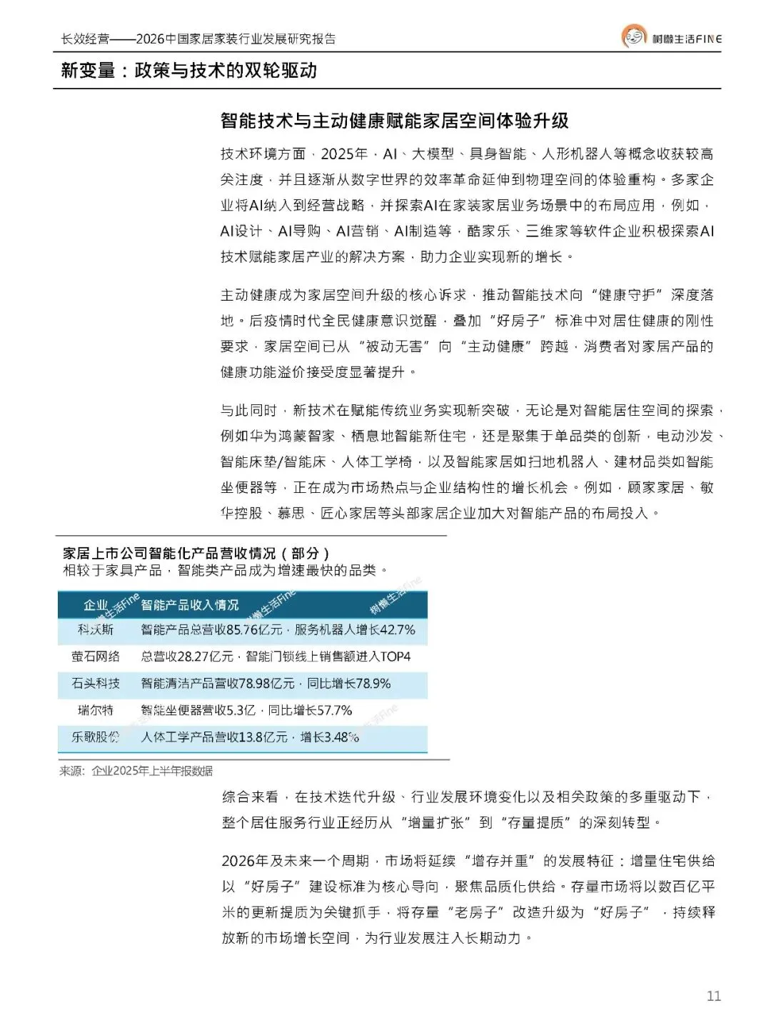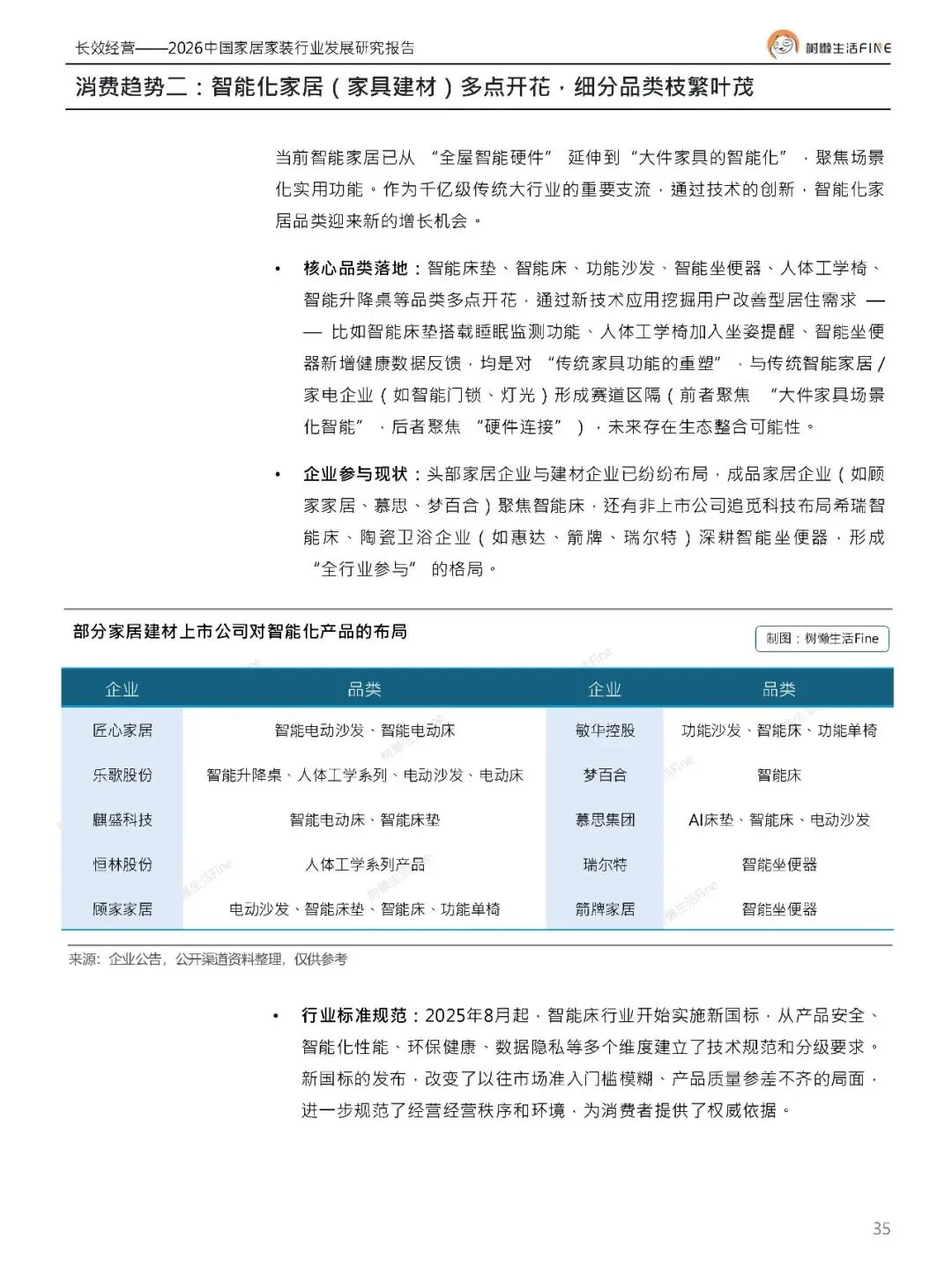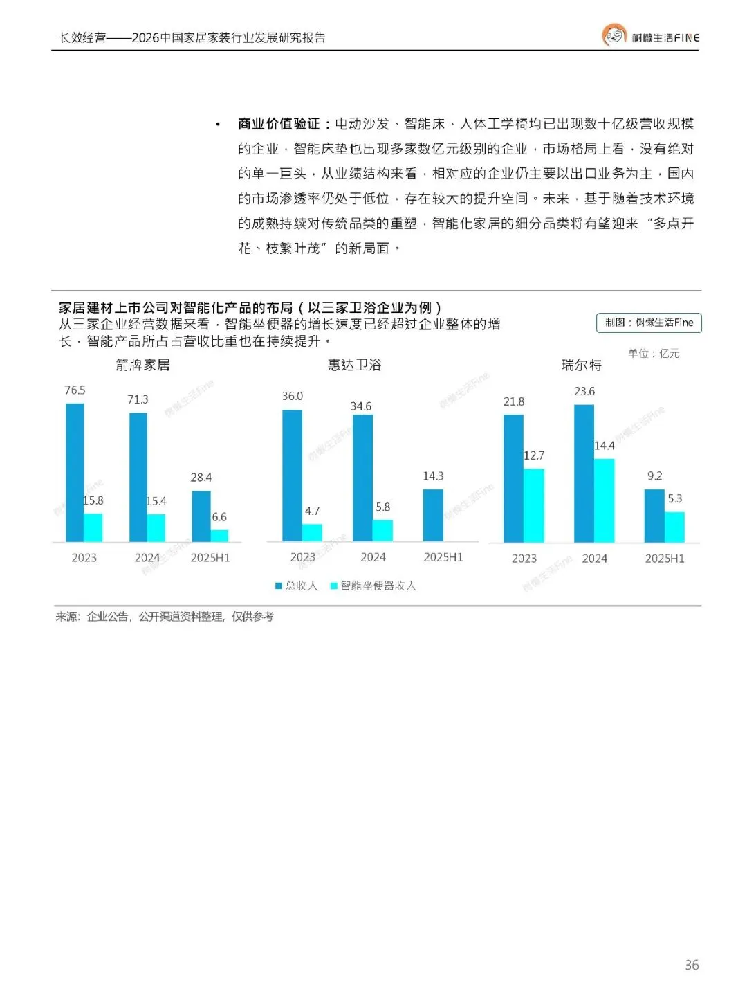 消费端的核心诉求,也在发生根本性的转变。消费者对居家环境的需求,已经从被动环保转向主动健康,无醛、抗菌、净醛等健康属性,成为家居产品的核心必备要素,行业的竞争焦点也从单一的材料环保达标,延伸到整体空间健康的打造。智能化家居的发展则多点开花,从全屋智能硬件延伸到大件家具的智能化,智能床垫、功能沙发、智能坐便器、人体工学椅等品类持续扩容,相关智能产品的增长速度,已经普遍超过对应企业的整体营收增速。