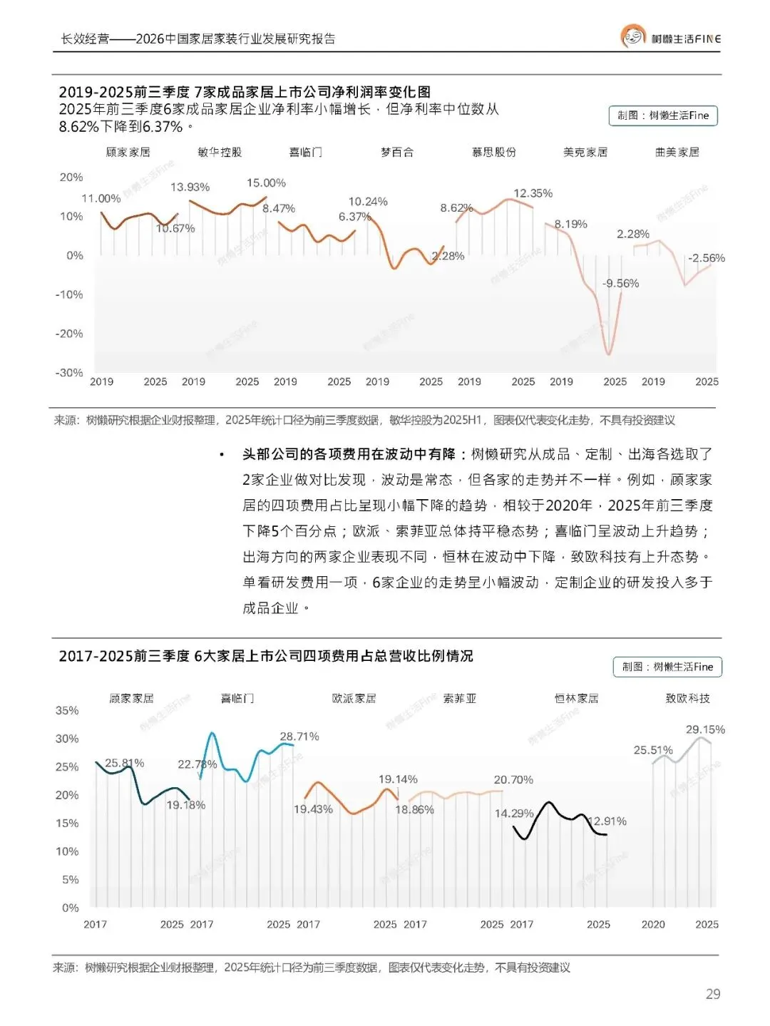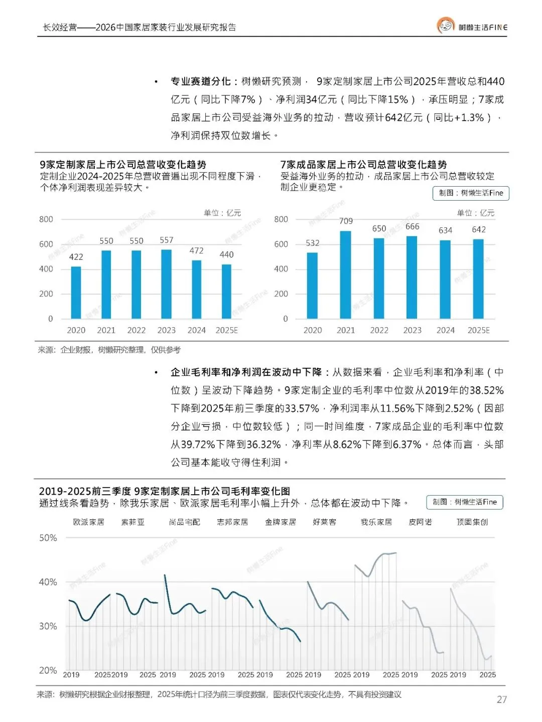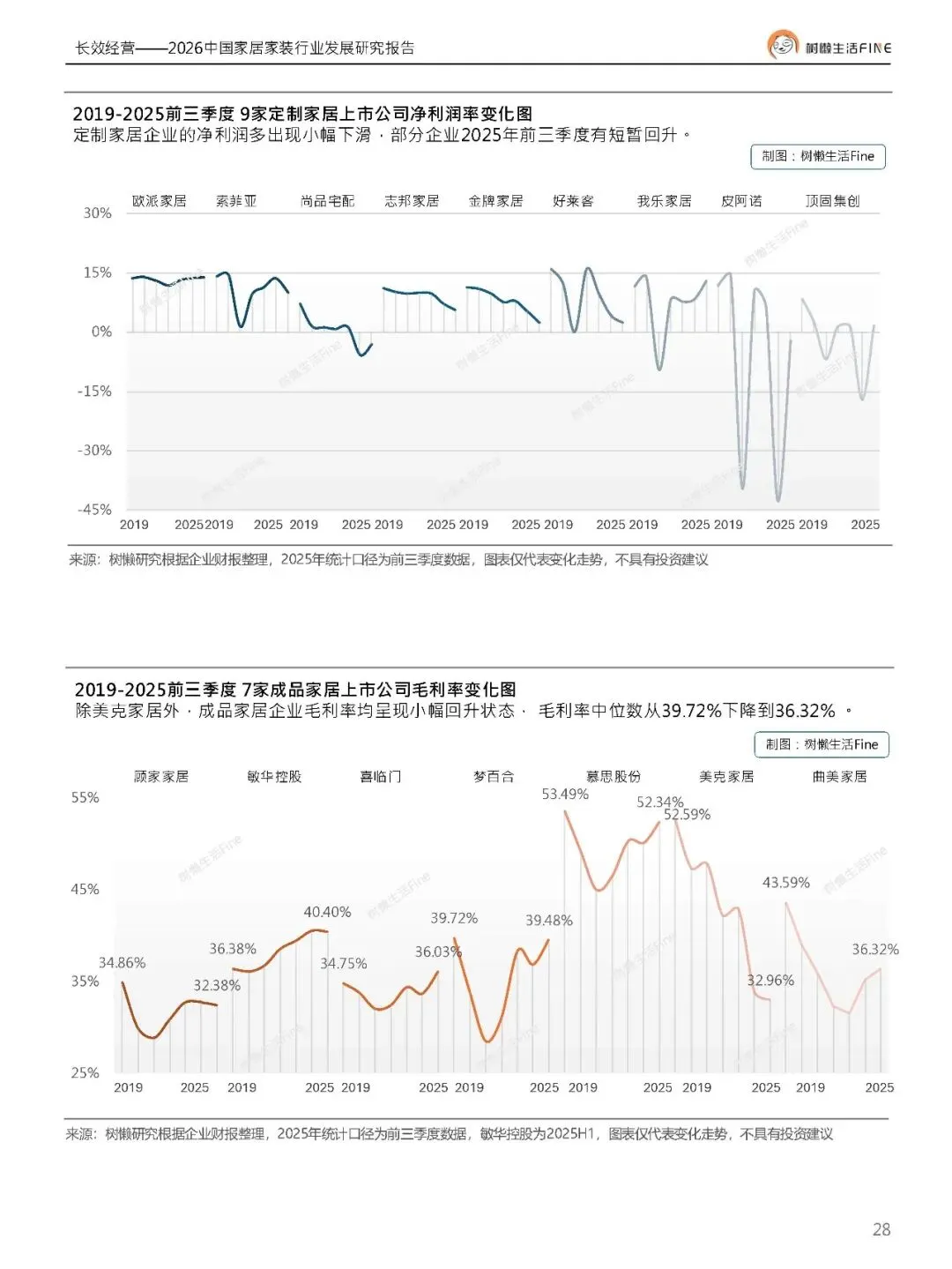 定制与成品家居赛道的表现,呈现出截然不同的走势。9 家定制家居上市公司 2025 年营收总和预计为 440 亿元,同比下降 7%,净利润 34 亿元,同比下降 15%。7 家成品家居上市公司则受益于海外业务拉动,全年营收预计 642 亿元,同比增长 1.3%,净利润保持双位数增长。盈利水平的波动同样明显,9 家定制企业的毛利率中位数从 2019 年的 38.52%,下降到 2025 年前三季度的 33.57%,净利润率更是从 11.56% 下降到 2.52%,成品家居企业的盈利水平虽同样有所回落,但整体稳定性远高于定制赛道。