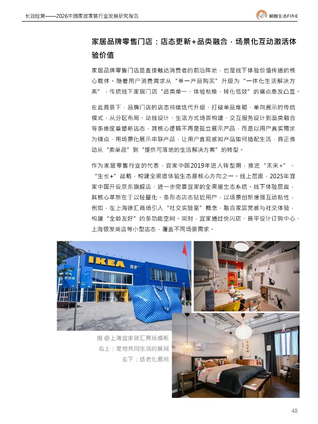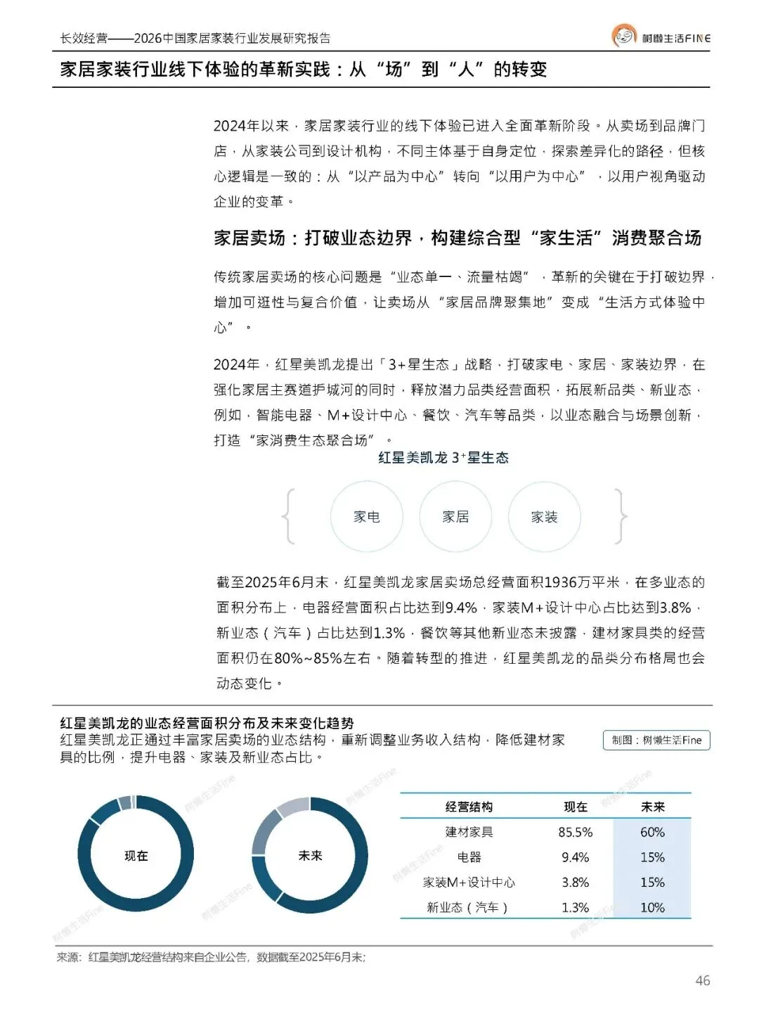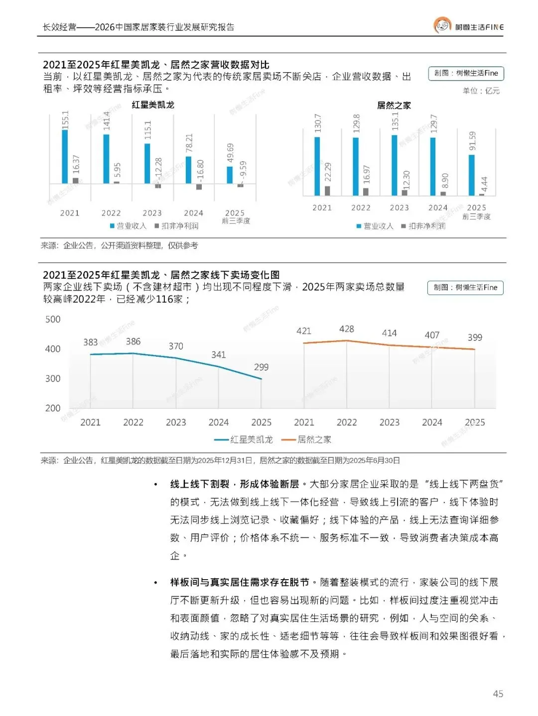 家居家装消费的主场始终在线下,但传统的线下体验模式正在经历全面革新。传统家居卖场,经营指标持续承压,2025 年两家企业的卖场总数量,较 2022 年的高峰已经减少 116 家。行业线下体验的核心逻辑,正在从以产品为中心,转向以用户为中心,家居卖场不断打破业态边界,家装公司重构一站式体验闭环,品牌零售门店推进品类融合与场景化展示,整个线下渠道的形态,正在朝着多元化、复合化的方向持续演变。