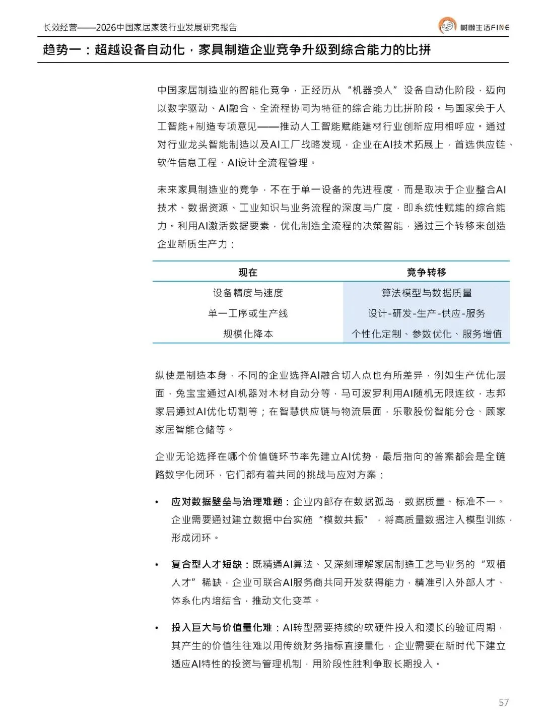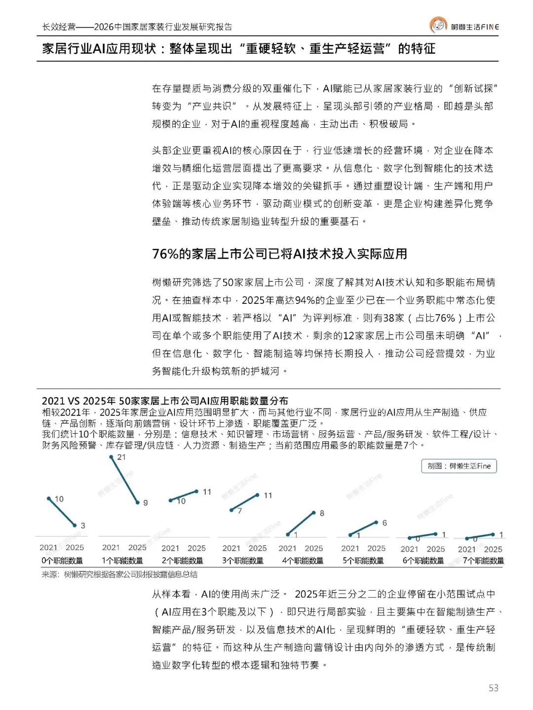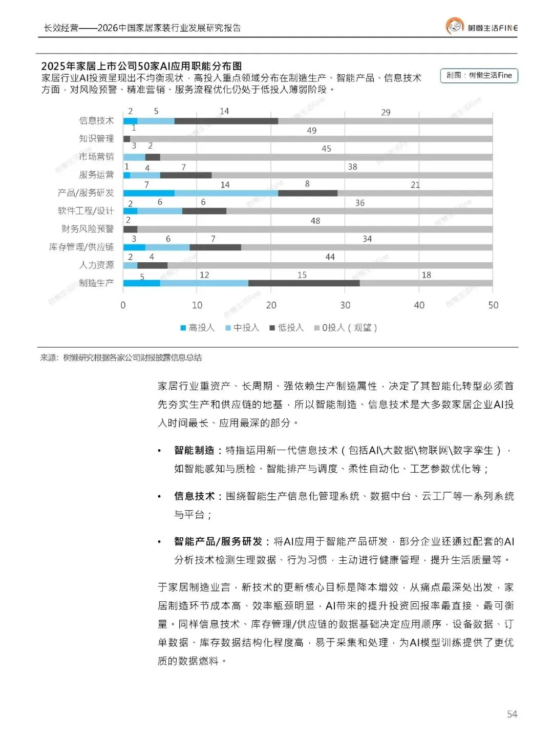 AI 赋能已经从行业的创新试探,转变为全行业的共识。调研显示,2025 年有 94% 的企业至少已在一个业务职能中常态化使用 AI 或智能技术,严格以 AI 为评判标准,也有 76% 的上市公司在单个或多个职能中落地了 AI 技术。但行业的 AI 应用,整体呈现出重硬轻软、重生产轻运营的特征,近三分之二的企业仍停留在小范围试点阶段,AI 应用仅覆盖 3 个及以下职能,投入重点集中在制造生产、产品研发和信息技术领域,对营销、服务运营、财务风险预警等环节的投入仍处于薄弱阶段。