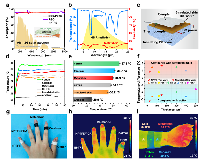 (a) NPTFE/RGO/PDMS复合织物辐射冷却和太阳加热机理的示意图 (b)复合织物制备流程图(c)复合织物数码照片 复合织物规整通孔结构的(d)光学和(e)扫描电镜图像 (f,g)复合织物的NPTFE层的SEM图像图2(a)复合织物的NPTFE层、RGO层和PDMS涂覆的RGO层在AM 1.5 G太阳光谱波段的光吸收率(b)在HBIR波段NPTFE无纺布的红外透过率和复合织物的红外发射率(c)室内辐射冷却测试示意图,27 °C环境下模拟皮肤覆盖不同织物样品的(d)实时温度曲线和最终(e)平衡温度(f))复合织物室内辐射制冷性能与部分文献的比较(g-i)复合织物与对比样在真实人体皮肤表面覆盖后的辐射冷却效果图图3 (a)一太阳光功率辐照下复合织物的在光热和冷却过程中的温度时间曲线和相对应的(b)红外相机图像