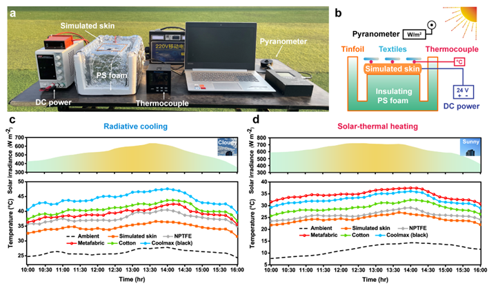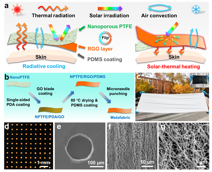 solar-heating”的论文,通过简便的刮涂工艺组装还原氧化石墨烯层(RGO)和微纳米聚四氟乙烯层(NPTFE)与透明强韧的聚二甲基硅氧烷(PDMS)支撑保护层于一体,制备了一种类三明治结构的NPTFE/RGO/PDMS复合织物,成功集成了被动辐射冷却、太阳能加热保暖和令人满意的可穿戴性能。