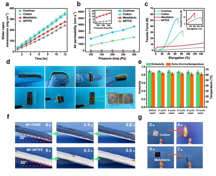 (c)不同太阳光辐照强度下的复合织物光热性能(d)0 ℃下的光热测试装置示意图与(e)复合织物样品、NPTFE和棉布的红外图像图4 户外连续热管理性能测试设备实物照片(a)与示意图(b),覆盖不同织物后的模拟皮肤在户外辐射冷却(c)和太阳光热(d)的过程中实时温度曲线图图5(a)水蒸气透过率(b)空气透过率(c)和断裂伸长率(d)复合织物多角度弯曲测试示意图(e)洗涤循环后的复合织物红外发射率与光热升温性能(f)30度斜面平板上复合织物PDMS面与NPTFE面的防水性能测试(g)棉布与复合织物的阻燃测试得益于光谱选择透过性的NPTFE微纳米纤维膜与高发射和光热效应RGO层的组装,复合织物将两种对立的功能集成于一体,通过织物的简单反转即可实现被动辐射冷却、光热加热和令人满意的多场景PTM可穿戴性能,具有良好全天候自适应户外热管理应用潜力。论文第一作者为北京化工大学博士生罗卓,通讯作者为北京化工大学杨冬芝教授和于中振教授。该工作得到国家自然科学基金和中央高校基础研究基金的资助。论文链接: