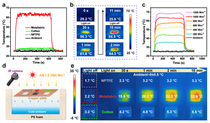 NPTFE纤维膜的纳米孔结构以及RGO层的高红外发射率特性赋予了复合织物出色的光谱选择特性。对于辐射冷却模式,复合织物基于米氏散射显示出高太阳光谱反射率(R>90%,0.25-2.5 μm)和HBIR范围的高透明性(T>90%,7-14 μm)。热量经由高发射的RGO层,穿透红外透明NPTFE向外部环境辐射耗散,与传统棉布相比,辐射冷却降温效果高3.2 ℃。寒冷环境下,通过简单地翻转可以将织物切换至RGO朝外的光热加热保暖模式。如0 ℃下,织物的表面温度可以在2 min内升至22 ℃,比传统棉布高17.0