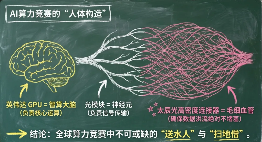 在人工智能大模型如洪水猛兽般席卷全球的今天,如果说英伟达的GPU是智算时代的“大脑”,那么光模块就是“神经元”,而太辰光所深耕的高密度光连接产品,则是连接这一切、确保数据洪流不堵塞的“毛细血管”。作为深耕光通信领域二十余载的“扫地僧”,太辰光正凭借其在无源器件领域的深厚积淀,在全球算力竞赛中扮演着一个不可或缺的“送水人”角色。