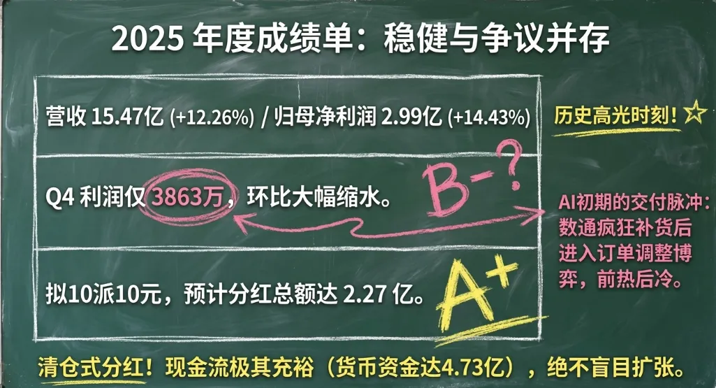3. 慷慨的分红与“分而治之”尽管Q4利润承压,但太辰光在分红上毫不含糊:拟每10股派现10元(含税),预计分红总额达2.27亿元。这种近乎“清仓式”的分红,一方面展现了公司充沛的现金流(货币资金达4.73亿元),另一方面也反映了管理层对现有经营模式极度自信,宁愿把钱分掉,也不在不确定的领域盲目扩张。