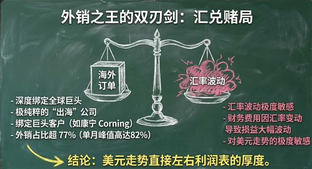 2. 外销之王的“汇兑赌局”太辰光是一家极其纯粹的“出海”公司。2025年其外销收入达到11.96亿元,占比超过77%。在某些月份,其海外销售占比甚至高达82%。这种结构是一把双刃剑:好的一面是深度绑定了像康宁(Corning)这样的全球巨头;坏的一面是汇率波动直接左右利润表。2025年财务费用因汇率变动导致损益大幅波动,显示出这家外向型企业对美元走势的极度敏感。
