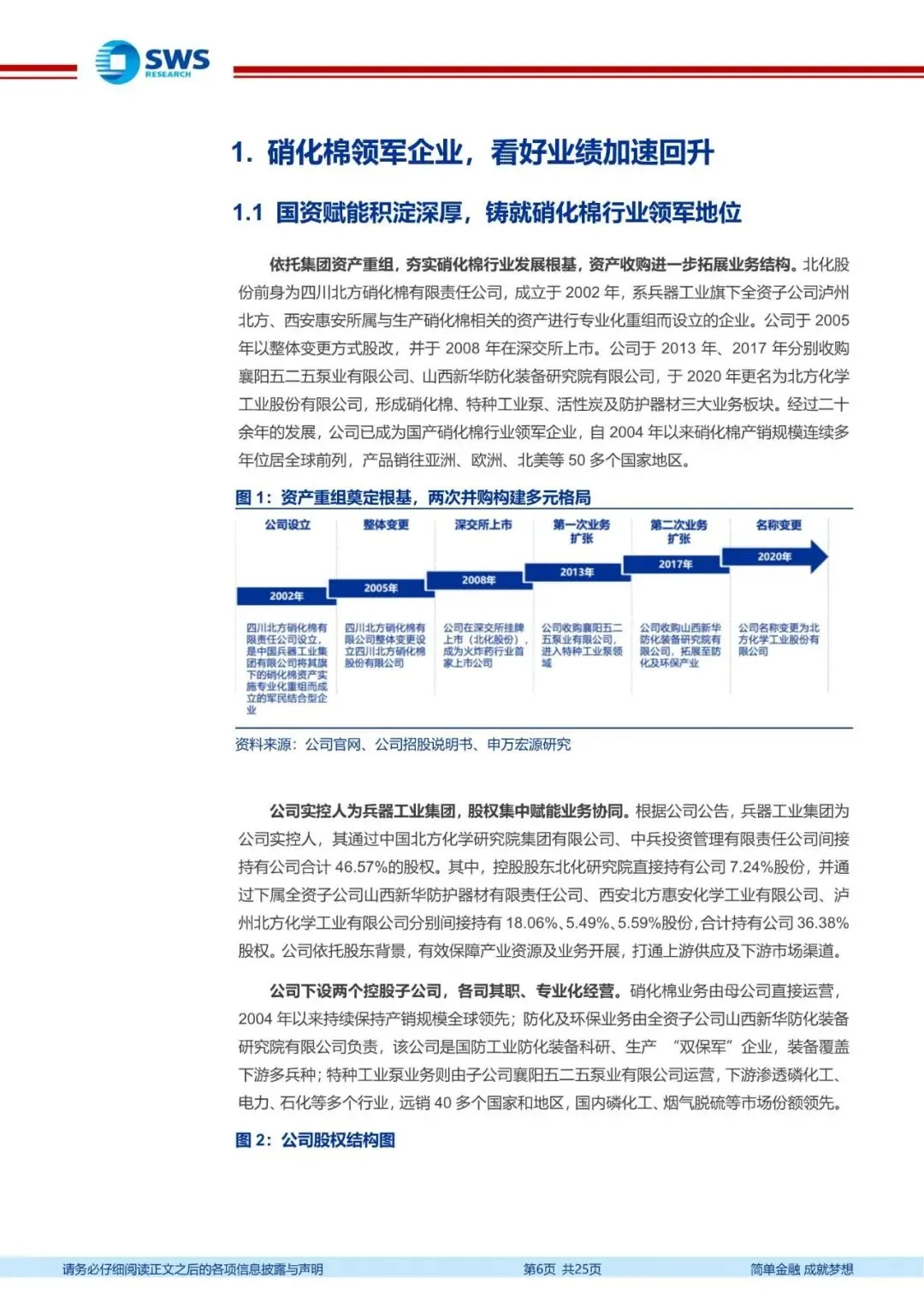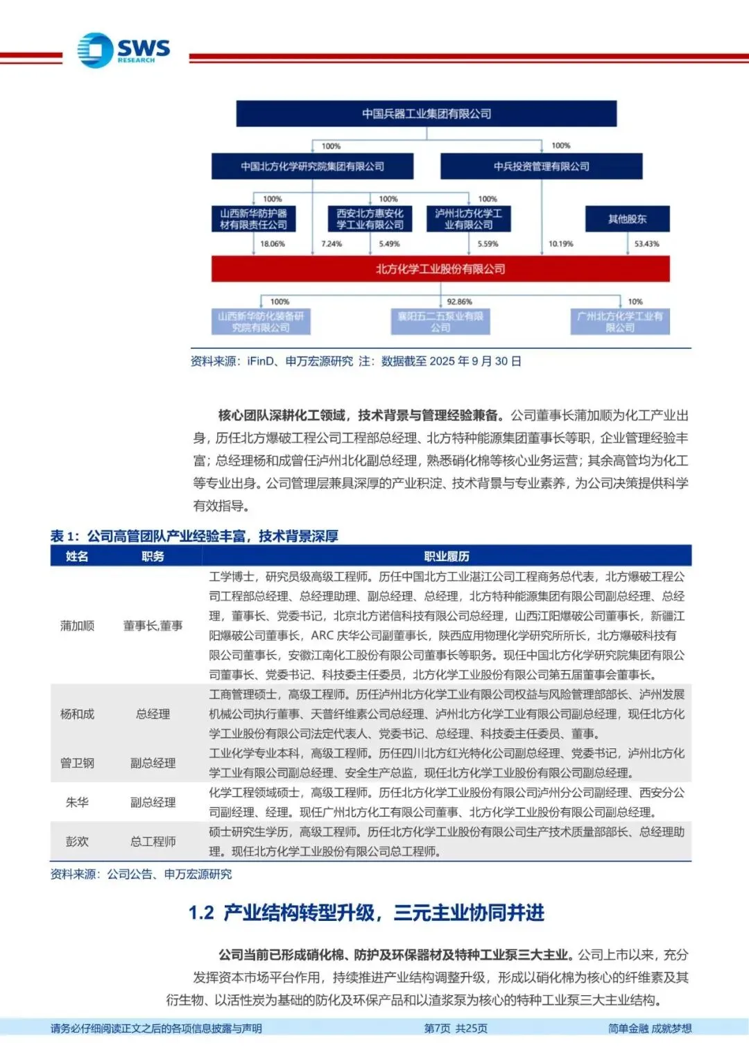 硝化棉领军企业,看好业绩加速回升。公司控股股东为兵器集团北化研究院,依托集团资产重组夯实硝化棉行业发展根基,资产收购进一步拓展防护装备及特种工业泵等业务。公司实控人为兵器工业集团,股权集中赋能业务协同,有效保障产业资源及业务开展,打通上游供应及下游市场渠道。管理层核心团队深耕化工领域,技术背景与管理经验兼备。