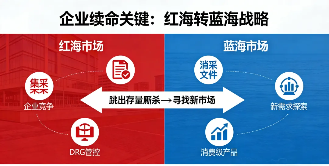 跳出存量厮杀的红海,去寻找不受集采和DRG强管控的消费级或蓝海市场,是企业续命的关键。