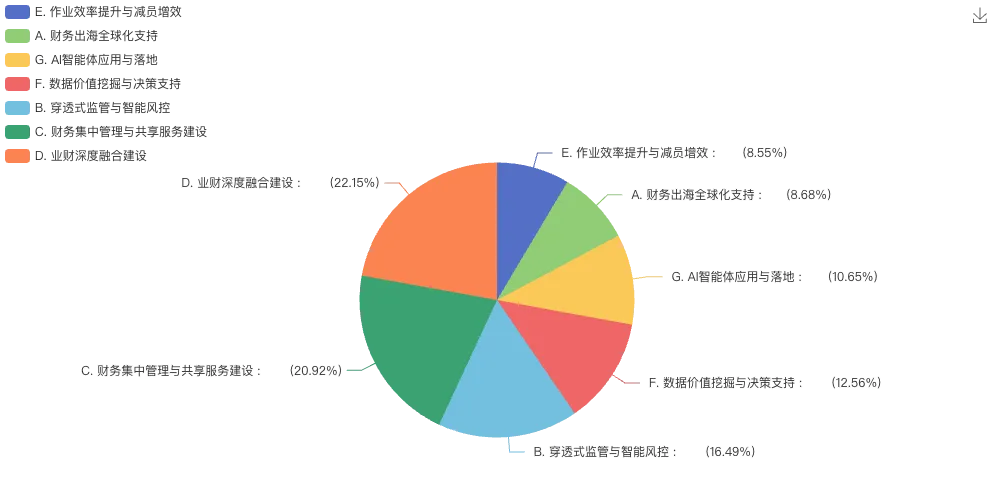 数据价值挖掘与决策支持、AI智能体应用与落地虽获得较高关注,但占比相对靠后,而财务出海全球化支持、作业效率提升与减员增效优先级较低,说明当前大型企业财务数智化仍处于基础建设阶段,前沿技术应用尚在探索,且受市场环境影响,内需端的管理升级需求远高于海外拓展需求。