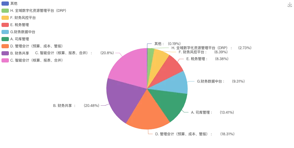 在近1-2年重点系统建设需求上,企业围绕“核算共享-管理会计-司库数据”三条主线布局:智能会计(核算、报表、合并)、财务共享成为重中之重,与核心关注点高度契合;管理会计(预算、成本、管报)需求达18.31%,凸显企业从“核算型财务”向“价值创造型财务”转型的迫切愿望;司库管理(13.41%)、财务数据中台(9.31%)进入规划视野,而税务管理、财务风控平台等因专业性强,需求占比相对较低。