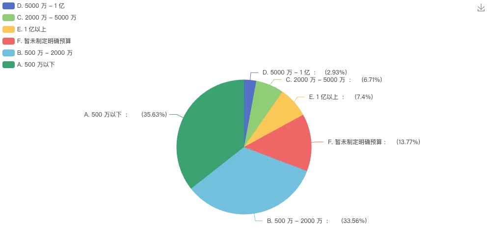 企业财务数智化转型资金投入呈现“两头小、中间大”的橄榄形分布:近七成企业(69.19%)计划在未来1-2年投入2000万元以下,其中500万以下占比35.63%,500万-2000万占比33.56%,反映大部分企业采取“小步快跑、稳健推进”的投入策略;仅7.40%的头部企业计划投入1亿元以上,大规模布局数智化转型;另有13.77%的企业暂未制定明确预算,处于观望状态。投入规模的分化与建设水平梯队分布高度吻合,多数企业因处于基础建设阶段,暂未进行大额投入。