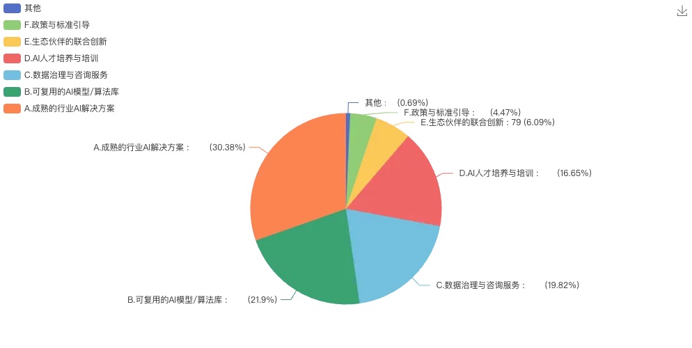 同时,企业推进AI应用面临核心支撑缺失的问题:三成企业认为最需要成熟的行业AI解决方案,两成企业需要可复用的AI模型/算法库,两成企业需要数据治理与咨询服务,而AI人才培养、生态伙伴创新、政策标准引导等配套支持的需求也较为迫切,反映当前市场缺乏适配不同行业的标准化AI解决方案,企业数据治理基础薄弱、专业人才短缺,成为AI规模化应用的核心障碍。