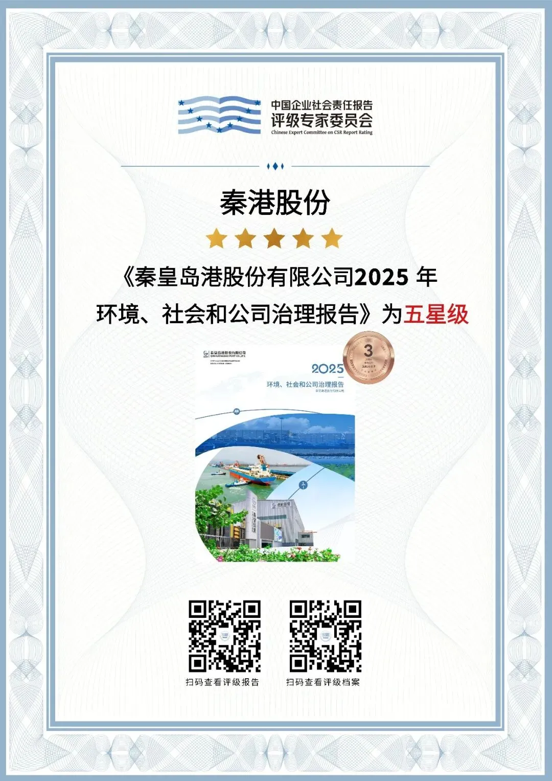 经“中国企业社会责任报告评级专家委员会”评定,《秦皇岛港股份有限公司2025年环境、社会和公司治理报告》为“五星级”,是一份卓越的企业可持续发展报告。