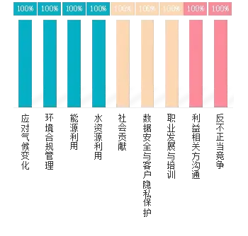 《报告》对环境维度下应对气候变化、环境合规管理、能源利用、水资源利用,社会维度下社会贡献、数据安全与客户隐私保护、职业发展与培训,治理维度下利益相关方沟通、反不正当竞争等议题的核心指标覆盖率最高,均达100%。