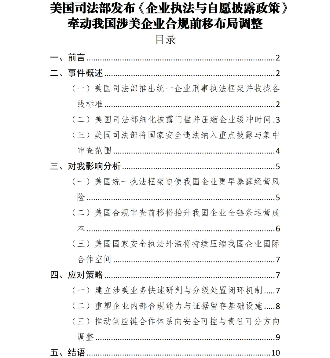 短短20天内,政策发布、案例示范和国家安全延伸说明接连完成,显示美方正把企业合规、自愿披露和国家安全执法加快并轨,试图以统一规则压缩企业回旋空间、前移风险暴露时点、强化跨部门集中管控。该动向已不再是“一般性白领犯罪执法调整”,而是美国借制度整合把国家安全审查更深嵌入跨境经营活动的重要步骤,需持续高度警惕。