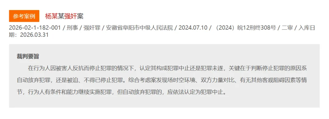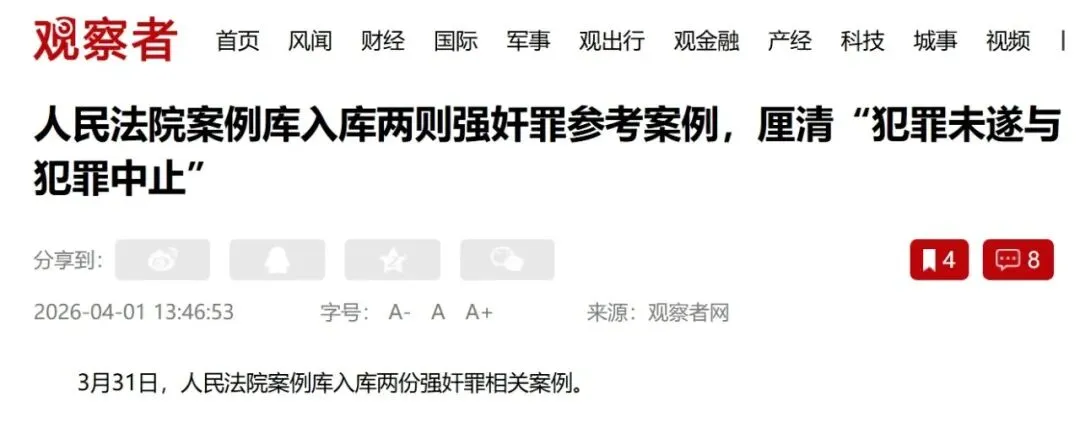今天是2024年4月1日。今天 ,观察者网发表了一篇文章《人民法院案例库入库两则强奸罪参考案例,厘清“犯罪未遂与犯罪中止”》,对最高法3月31日人民法院案例库入库两份强奸罪相关案例进行分析。