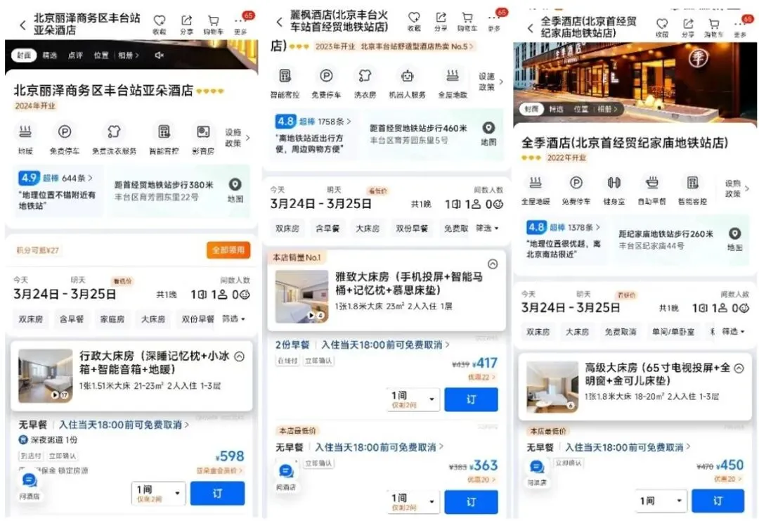 时间回到近期,以北京丰台首经贸地区为例,3月24日,亚朵不含早餐的大床房价格是598元/晚,紧挨着亚朵的麗枫酒店不含早餐的价格仅为363元/晚,面积同样是23平米。旁边不远的全季,价格为450元/晚。