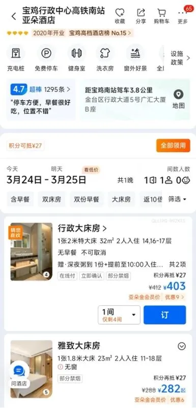 对比四线城市,以陕西省宝鸡市为例,高铁南站附近的亚朵一晚价格超过了400元。当然,如果你不追求生活品质,花282元住个无窗房也是可以的。