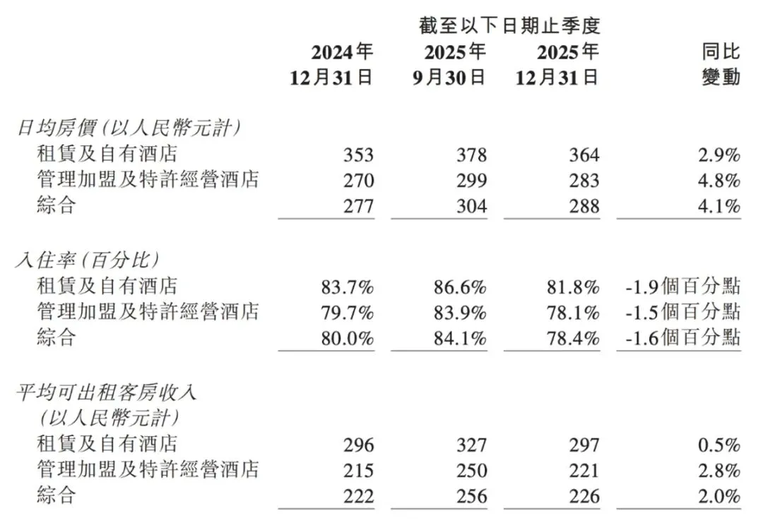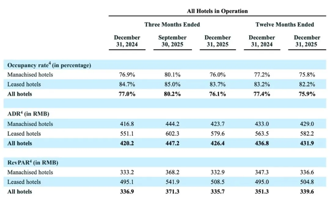 同样华住,2025年日均房价(ADR)上涨了4.1%,入住率(OCC)下降了1.6%,平均可出租客房收入(RevPAR)最终上涨了2%,整体同比表现比亚朵要好。