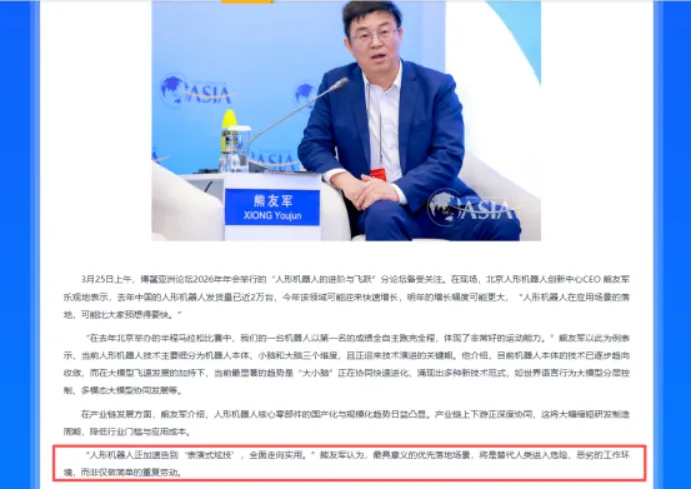 在刚刚结束的博鳌亚洲论坛2026年年会上,北京人形机器人创新中心CEO熊友军指出:“人形机器人正加速告别‘表演式炫技’,全面走向实用”。