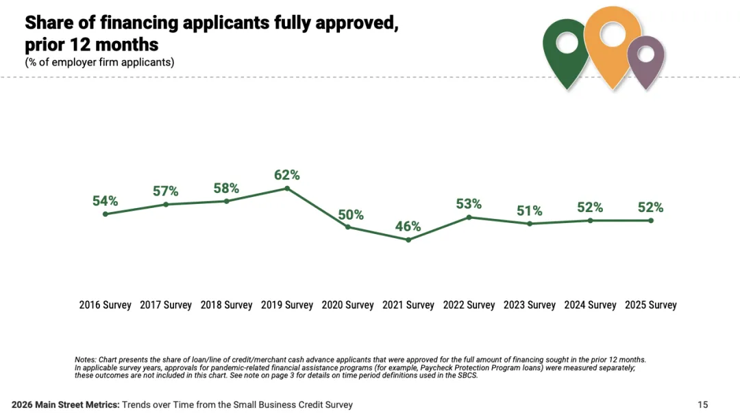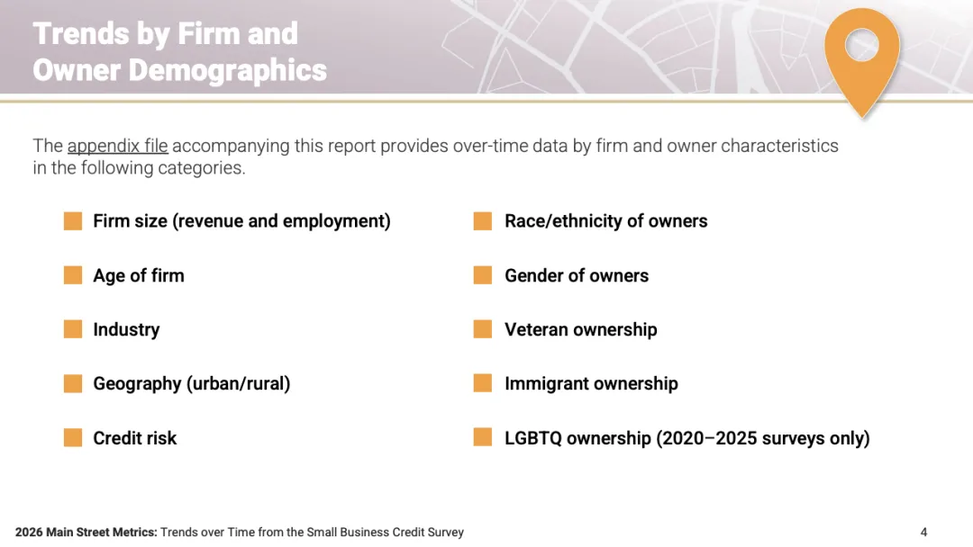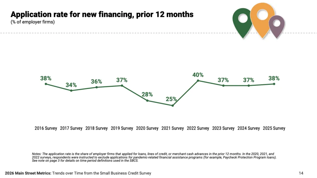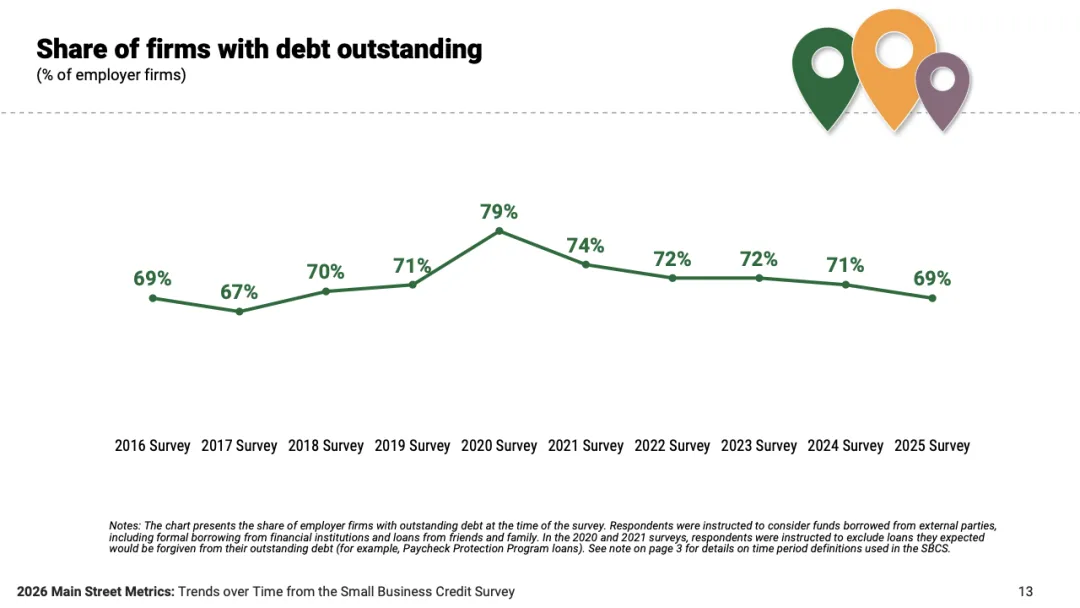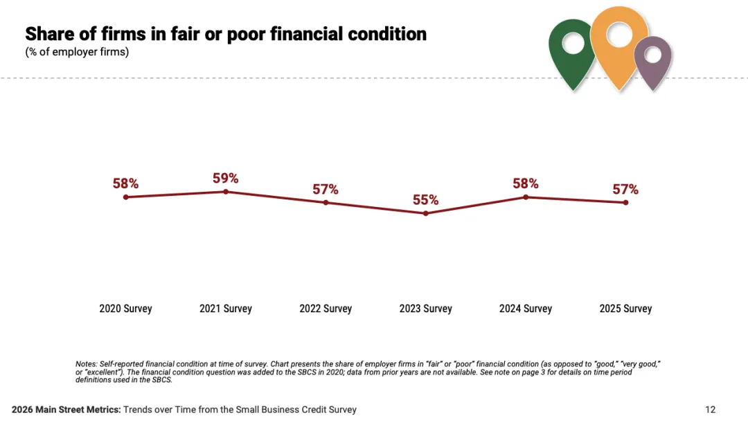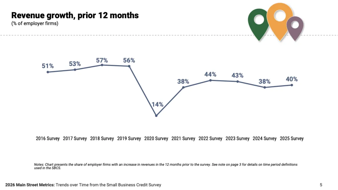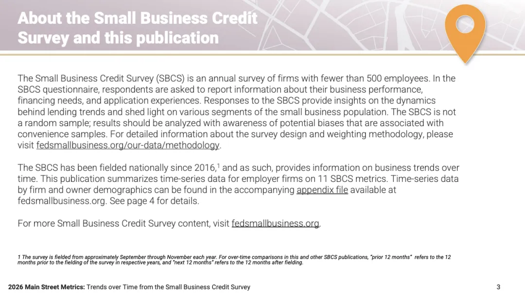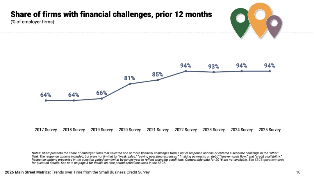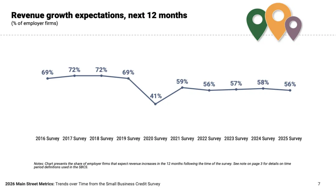 基于美联储小企业信贷调查的长期数据序列,该报告系统刻画了2016至2025年间美国小企业经营与融资环境的结构性变化。 数据显示,小企业景气度呈现明显的周期波动,并在疫情冲击后进入修复但未完全恢复的阶段。