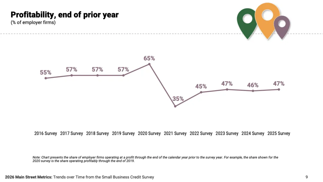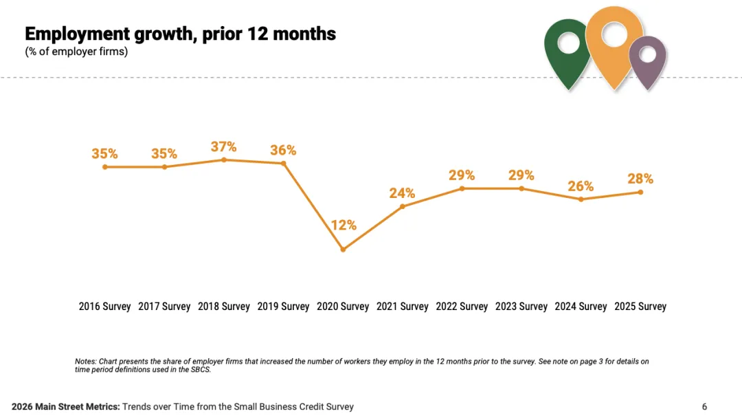 收入与就业增长呈现典型的“V型修复”轨迹。2016至2019年收入增长企业占比稳定在51%-57%区间,2020年骤降至14%,随后在2021年反弹至38%,但2025年仍仅恢复至40%。同期就业增长从35%-37%区间跌至2020年的12%,2025年回升至28%,仍低于疫情前水平。两项指标共同表明,小企业经营扩张能力虽恢复,但动能明显减弱,复苏质量偏弱。