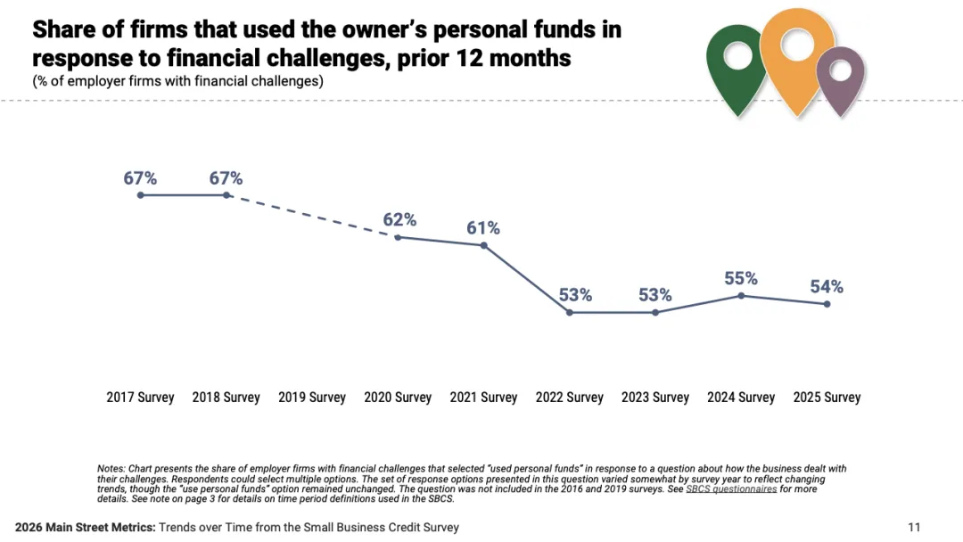 融资环境的紧张程度显著上升。面临财务挑战的企业占比从2017年的64%升至2022年后的94%高位并持续维持,反映成本、现金流与融资可得性压力全面加剧。在应对方式上,使用企业主个人资金的比例从2017年的67%下降至2025年的54%,虽有所缓解,但仍处高位,表明内生融资仍是重要补充渠道。