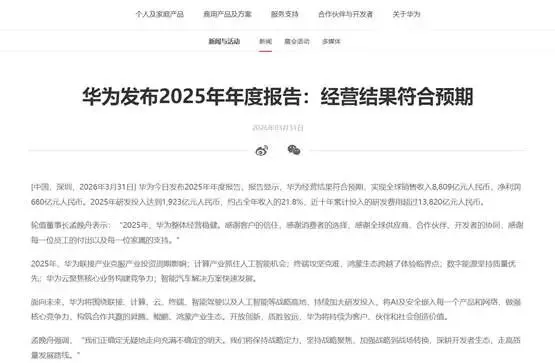 3月31日,华为发布2025年年度报告:全年实现全球销售收入8809亿元,同比增长2.2%;净利润680亿元,同比增长8.7%;研发投入1923亿元,占比达21.8%,近十年累计研发投入超13820亿元。
