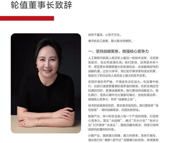 华为轮值董事长孟晚舟在致辞中直言:“人工智能是未来十年最大、最确定的战略机遇”,同时强调华为将坚持战略聚焦、做强核心竞争力、深耕开发者生态、走高质量发展路线,并以一句“我们正确定无疑地走向充满不确定的明天”,点明华为当下的战略定力与长期格局。