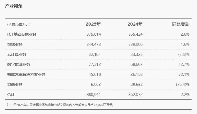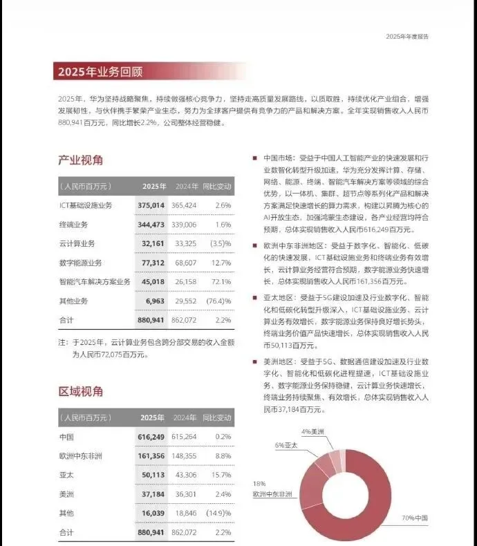 先给大家报一组核心数据,不用记太复杂,重点看三个关键数:全年全球销售收入8809亿元,同比小涨2.2%;研发投入直接干到1923亿元,占总营收的21.8%;还有最亮眼的智能汽车业务,营收450.18亿元,同比暴涨72.1%。这三个数,基本就能概括华为2025年的整体表现:稳扎稳打,新业务爆发力拉满。