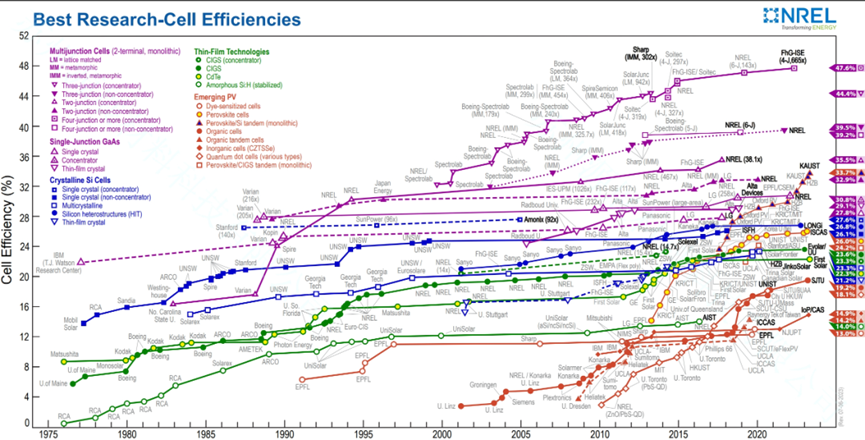 钙钛矿电池效率进展迅速,根据美国可再生能源国家实验室(NREL)最新公布的数据,单结钙钛矿太阳能电池的认证效率提升到了26.1%,该成果是由中国科学技术大学的徐集贤教授团队取得的重要进展。钙钛矿/硅叠层电池纪录创造者来自沙特阿卜杜拉国王科技大学(KAUST),认证效率达到33.7%。