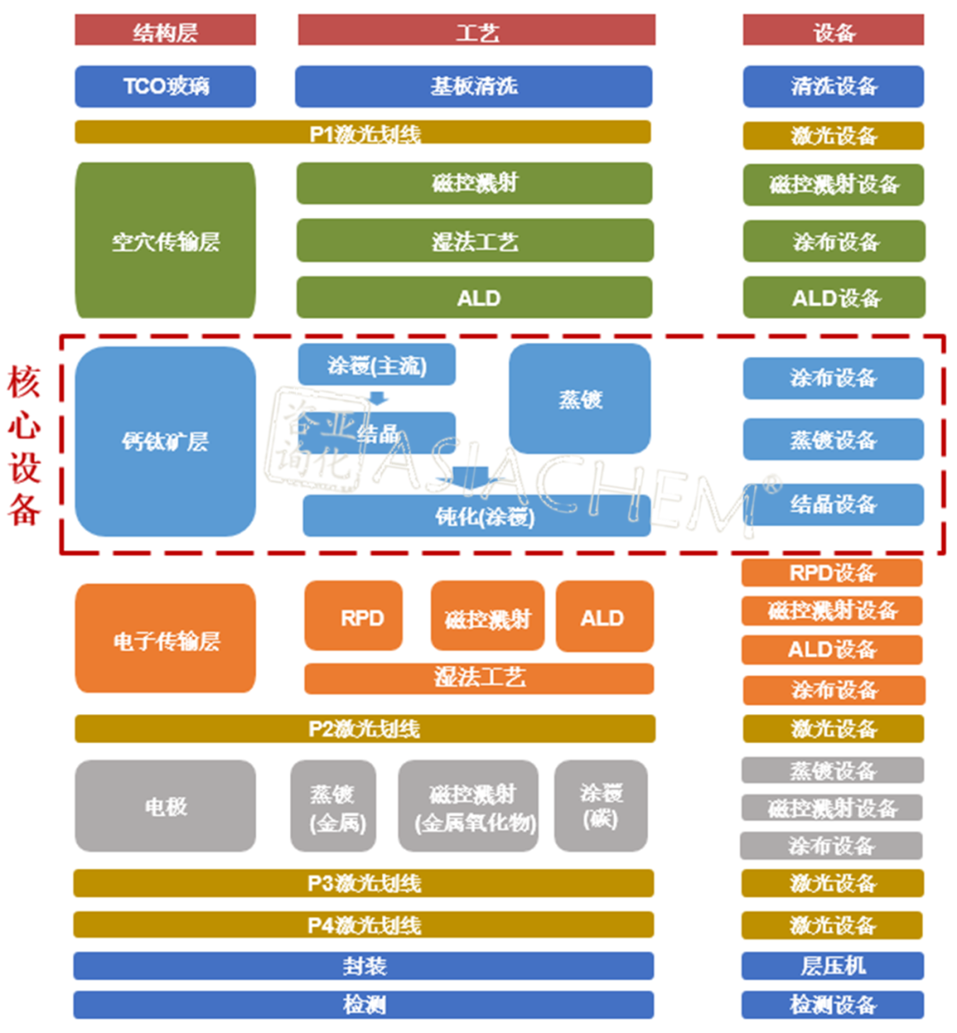 钙钛矿组件制备主要涉及4类设备:镀膜设备、涂布设备、激光设备和封装设备。钙钛矿电池制备所需的主要工艺及设备如下图所示。