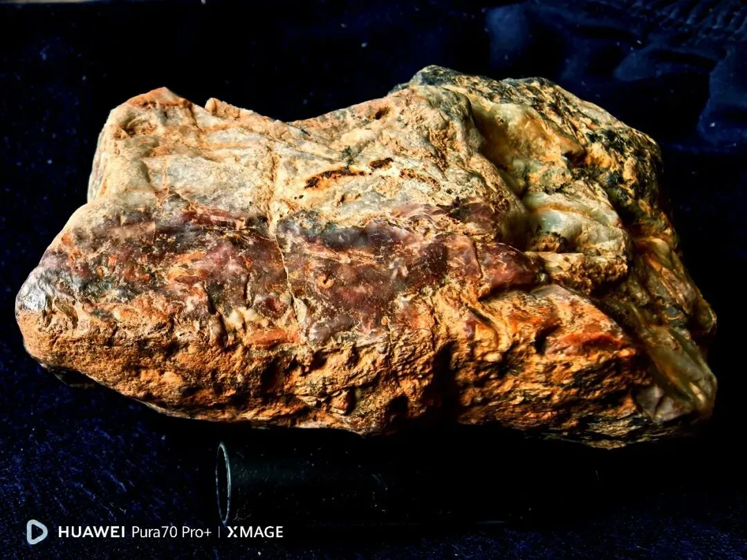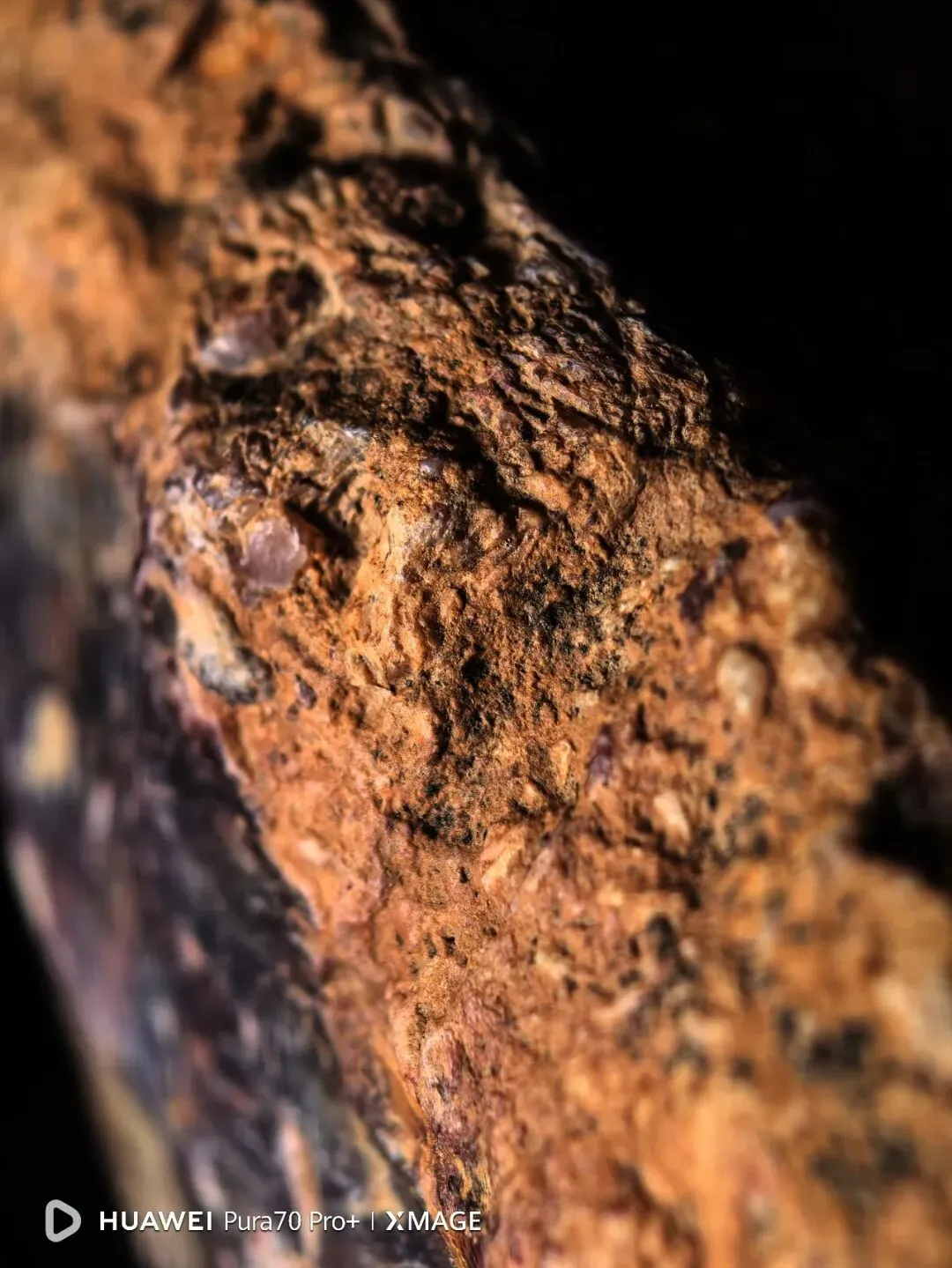 5. 空气动力学特征:陨石左右两侧可见鲜明的气道特征,呈棕红色与白色交织状,为陨石进入地球大气层后,高速飞行与大气摩擦所致,气道的形态与分布的,反映了陨石飞行过程中的姿态、速度及空气阻力变化,是研究陨石空气动力学行为的重要依据。