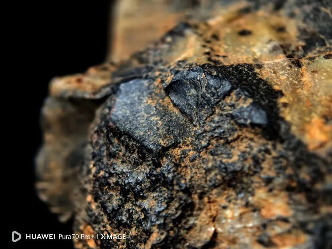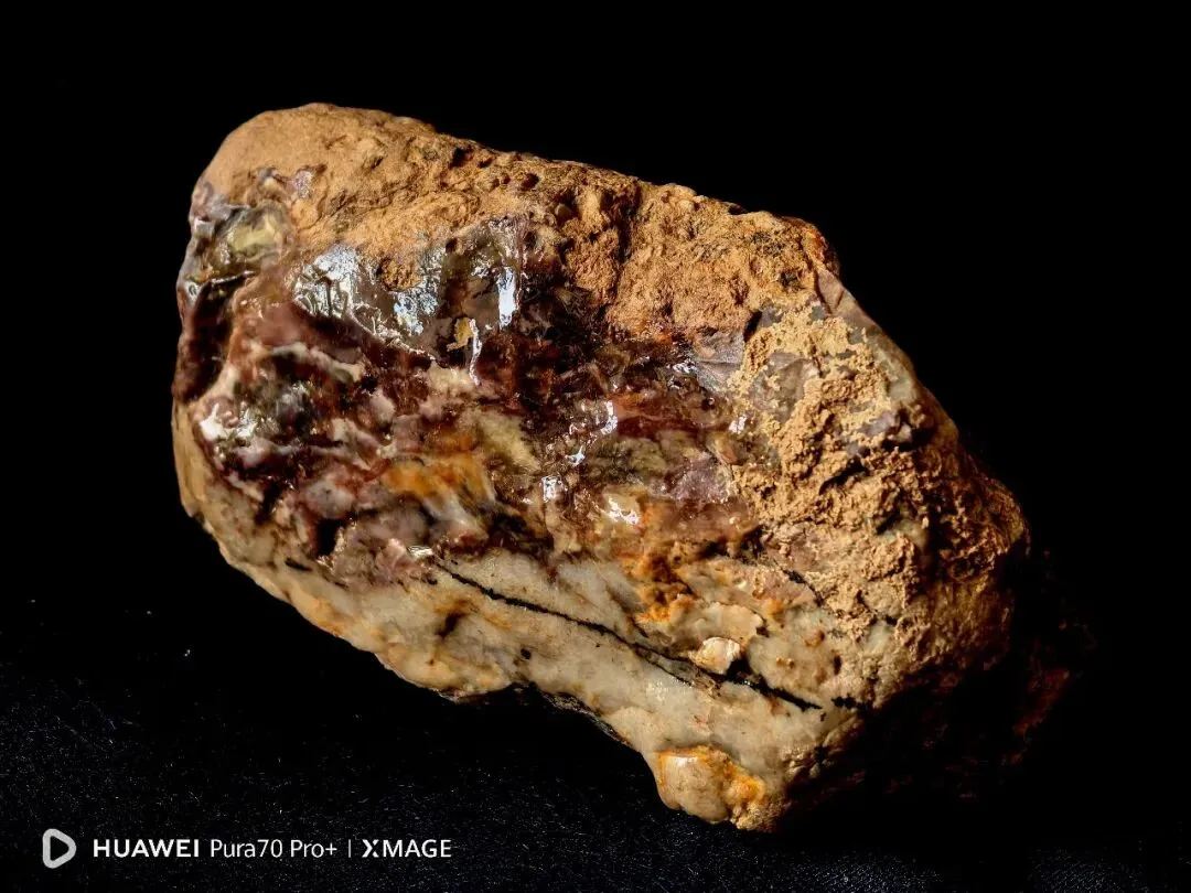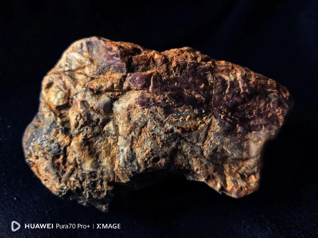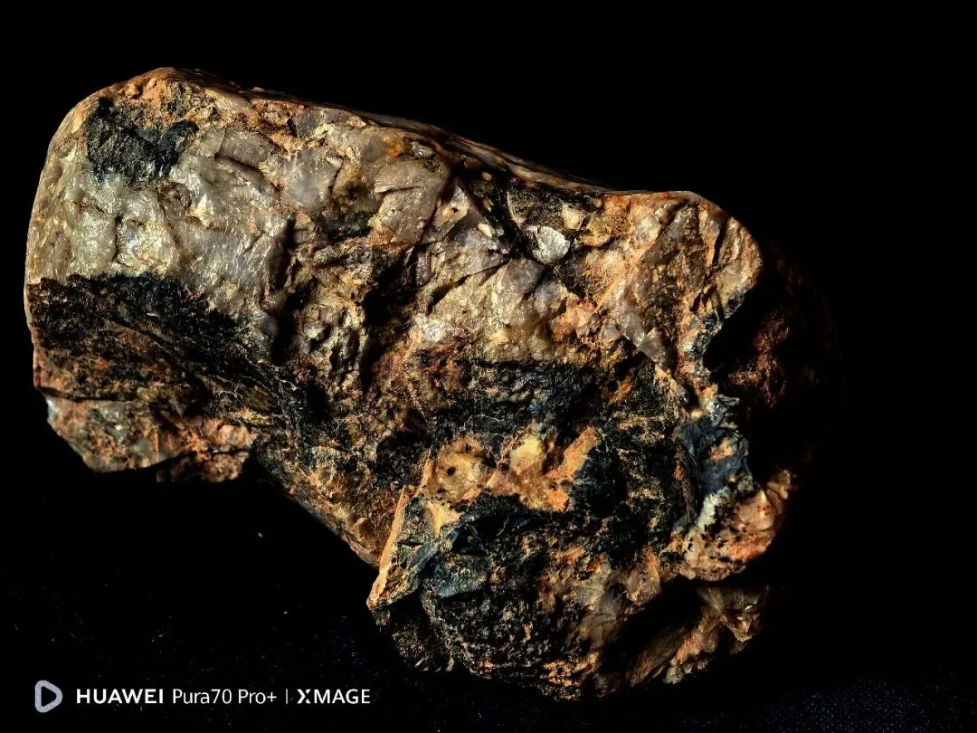 陨石色泽:整体呈现黄白黑棕相间的复合色泽,色彩层次分明。其中,白色部分主要为斜长岩成分,黑色部分为陨硫铁,黄色部分为落地后高温热熔地面土壤形成的附着物,棕红色部分为飞行过程中与大气摩擦形成的气道痕迹,色泽分布与陨石的形成过程、爆炸特征及落地后的物理反应高度相关,是其独特性的重要体现。