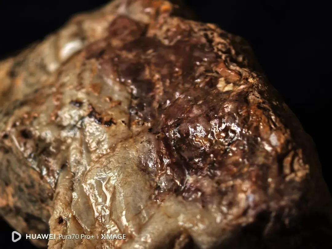 1. 玻璃质熔壳:陨石表面覆盖一层厚度约1mm的透明玻璃质熔壳,这是陨石进入地球大气层后,表面物质经高温熔融、快速冷却形成的非晶质物质,是陨石区别于地球岩石的核心标志之一,其透明度与厚度反映了陨石进入大气层后的温度变化与飞行时间。显微镜下观察,熔壳质地均匀,无明显裂纹,说明陨石在飞行过程中受热均匀,且落地后未受到严重的外力侵蚀。