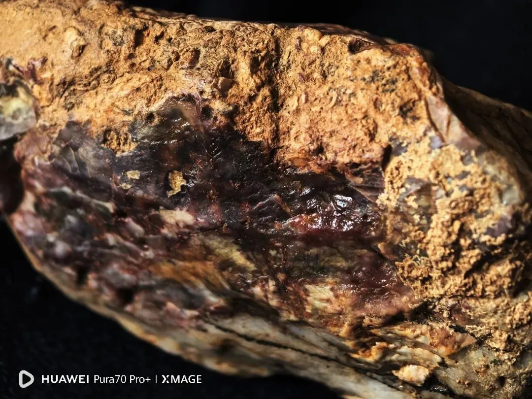 3. 黄色附着物:陨石表面及底部均有黄色附着物,其中底部有一处长8.9cm×宽约2cm的黄色融合物质,经检测确认,该附着物为陨石落地后,高温热熔地面土壤形成的融合体,显微镜观察可见其中含有角砾岩与碎屑岩颗粒,这一特征印证了陨石落地时的高温状态,同时为研究陨石落地后的物理化学反应提供了重要线索。