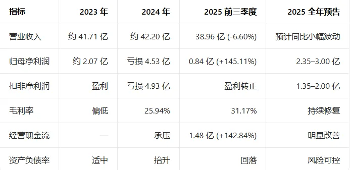 全年业绩预告:2025 年归母净利润2.35-3.00 亿元,同比增长151.92%-166.28%(2024 年亏损 4.53 亿元);扣非净利润1.35-2.00 亿元,同比增长127.38%-140.56%(2024 年亏损 4.93 亿元)。