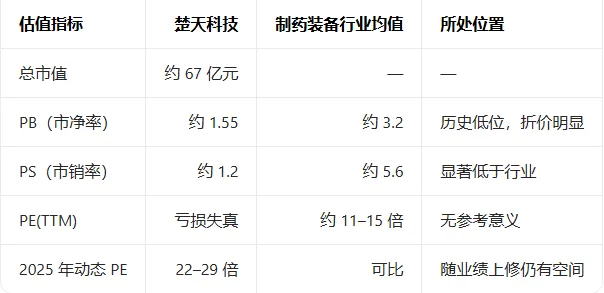 行业对比:制药装备行业平均 PB 约3.22,楚天科技 PB 仅 1.55,折价超 50%;行业平均 PE 约 11.28,公司 2025 年业绩扭亏后,动态 PE 有望回落至25-30 倍区间,估值修复空间大。