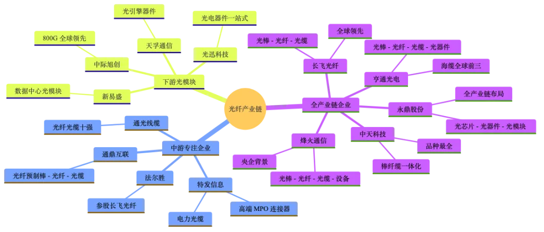 图:光纤产业链竞争格局思维导图(全产业链企业 vs 中游专注企业 vs 下游光模块)