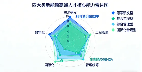 结合产业招聘需求、行业技术发展要求与岗位核心职责,新能源高端人才可划分为四大核心类型,各类人才的能力画像、核心素养与技能要求各有侧重,共同构成双碳目标下新能源产业的人才核心能力体系,具体如下: