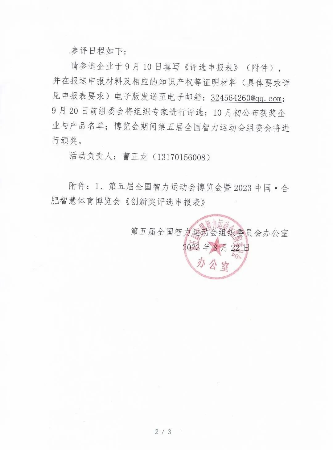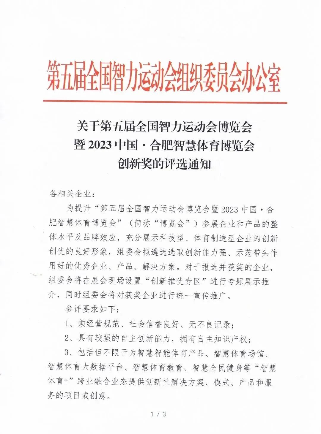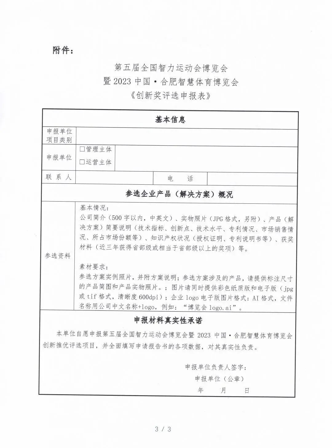附件:1、第五届全国智力运动会博览会暨2023中国·合肥智慧体育博览会《创新奖评选申报表》