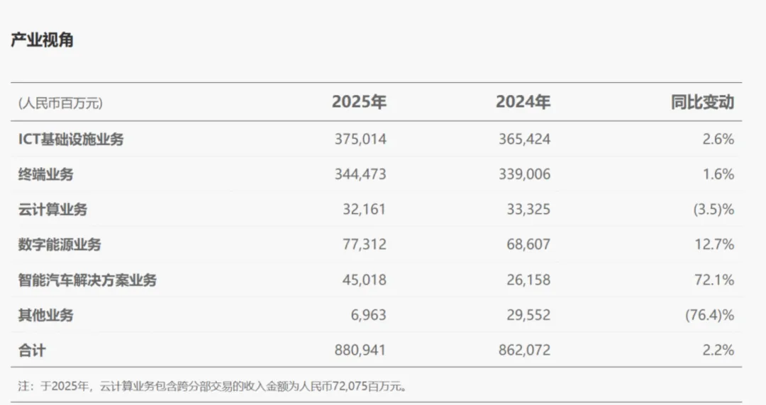 ICT基础设施作为基本盘,收入为3750.14亿且增长2.6%,数字能源业务收入773.12亿增长12.7%,还有称实际营收超过780亿,云计算业务收入321.61亿却下降3.5%,在激烈的市场竞争中略显乏力